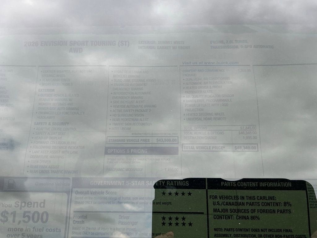 Summit White 2026 Buick Envision Sport Touring AWD 9-Speed Automatic 2.0L Turbocharged 3-Channel Programmable Universal Home Remote, 3.47 Final Drive Axle Ratio, 30 Diagonal LCD Display, 4-Wheel Disc Brakes, 9 Speakers, ABS brakes, Air Conditioning, Air Quality Indicator Sensor, Alloy wheels, AM/FM radio: SiriusXM, Auto High-beam Headlights, Auto-dimming door mirrors, Auto-dimming Rear-View mirror, Automatic Air Recirculation, Automatic temperature control, Bose Premium 9-Speaker Audio System Feature, Brake assist, Bumpers: body-color, Comfort and Convenience Package, Compass, Delay-off headlights, Driver 4-Way Power Lumbar Seat Adjuster, Driver 8-Way Power Seat Adjuster, Driver door bin, Driver vanity mirror, Dual front impact airbags, Dual front side impact airbags, Dual-Zone Automatic Climate Control Air Conditioning, Electronic Stability Control, Emergency communication system: OnStar and Buick connected services capable, Exterior Parking Camera Rear, Four wheel independent suspension, Front anti-roll bar, Front Bucket Seats, Front Center Armrest, Front Passenger 6-Way Manual Seat Adjuster, Front reading lights, Fully automatic headlights, Hands-Free Power Programmable Liftgate, Heads-Up Display, Heated door mirrors, Heated Driver and Front Passenger Seats, Heated Steering Wheel, Illuminated entry, Knee airbag, Leather steering wheel, Low tire pressure warning, Memory seat, Navigation System, Occupant sensing airbag, Outside temperature display, Overhead airbag, Overhead console, Panic alarm, Passenger door bin, Passenger vanity mirror, Perforated Leather-Appointed Seat Trim, Power door mirrors, Power driver seat, Power Liftgate, Power Panoramic Tilt-Sliding Moonroof, Power steering, Power windows, Premium audio system: Buick Infotainment System, Radio data system, Radio: Infotainment Center, Rear anti-roll bar, Rear reading lights, Rear seat center armrest, Rear window defroster, Rear window wiper, Remote keyless entry, Security system, SiriusXM Trial Subscription, Speed control, Split folding rear seat, Spoiler, Sport steering wheel, Steering wheel mounted audio controls, Telescoping steering wheel, Tilt steering wheel, Traction control, Trip computer, Variably intermittent wipers, Wheels: 20 Carbon Flash Metallic Alloy, Wireless Apple CarPlay/Wireless Android Auto.